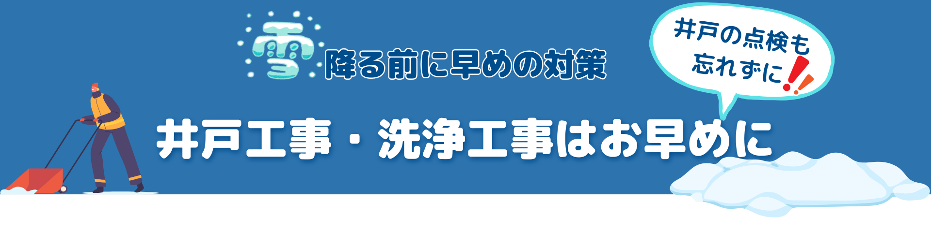 当社は雪国南魚沼で培ってきた豊富な経験と実績があります。雪国の生活に欠かせない井戸というライフラインを担う会社として、社員一人ひとりが、設備に関する知識と技術力、品質向上させることに努めております。地域社会へ快適な生活を提供し、皆様のベストパートナーとして、社会に貢献し続ける企業を目指しています。